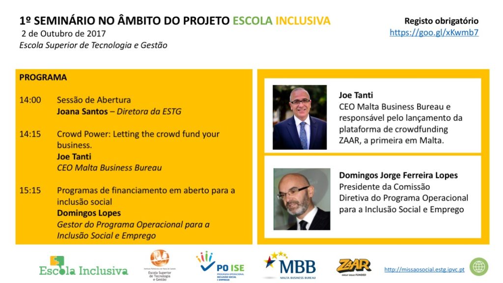 No dia 2 de Outubro de 2017, realizar-se-á o 1º Seminário do Projeto Escola Inclusiva, projeto âncora em curso na Escola Superior de Tecnologia e Gestão desde dezembro de 2016. Este projeto conta com várias competências (design, turismo, civil, alimentar, computação gráfica, informática, gestão, eletrónica) e tem colaborado com várias instituições para as auxiliar e promover a inclusão social. Neste